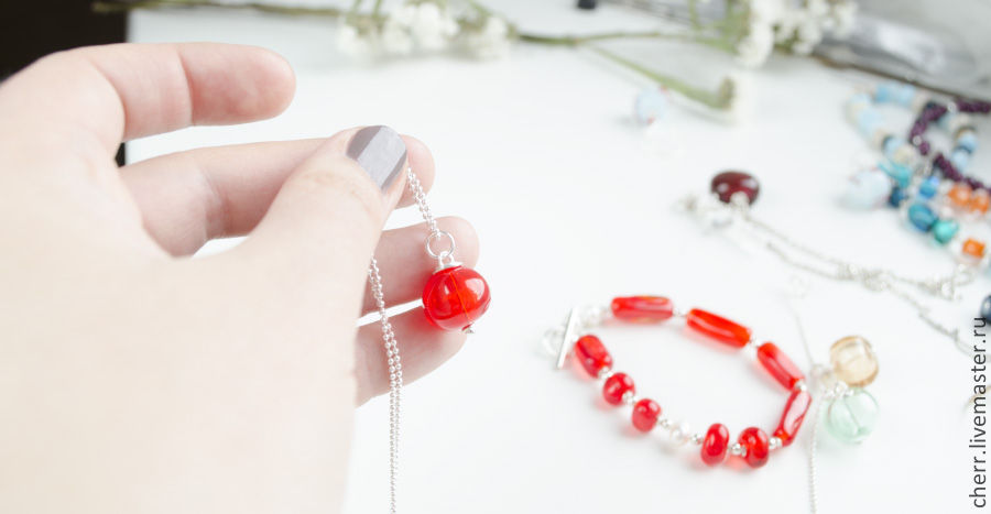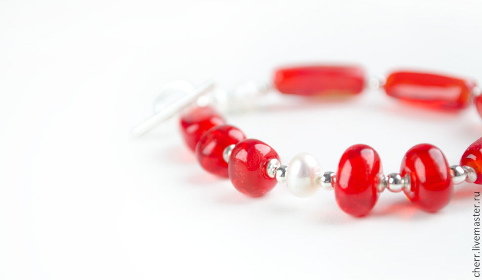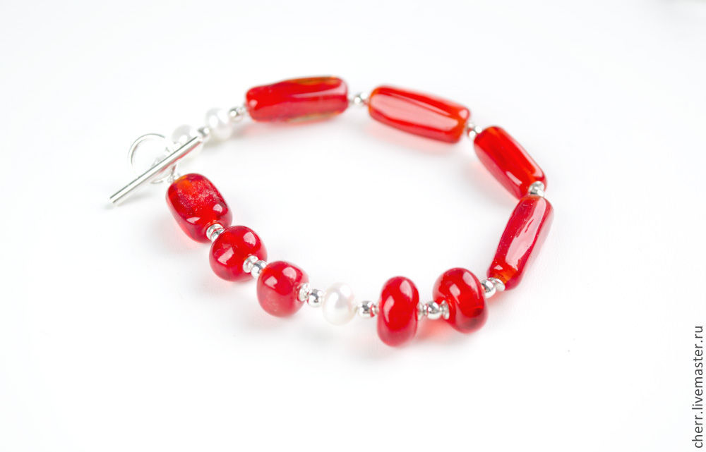 Браслет и кулон из огненно-красного стекла, серебра и натурального жемчуга.